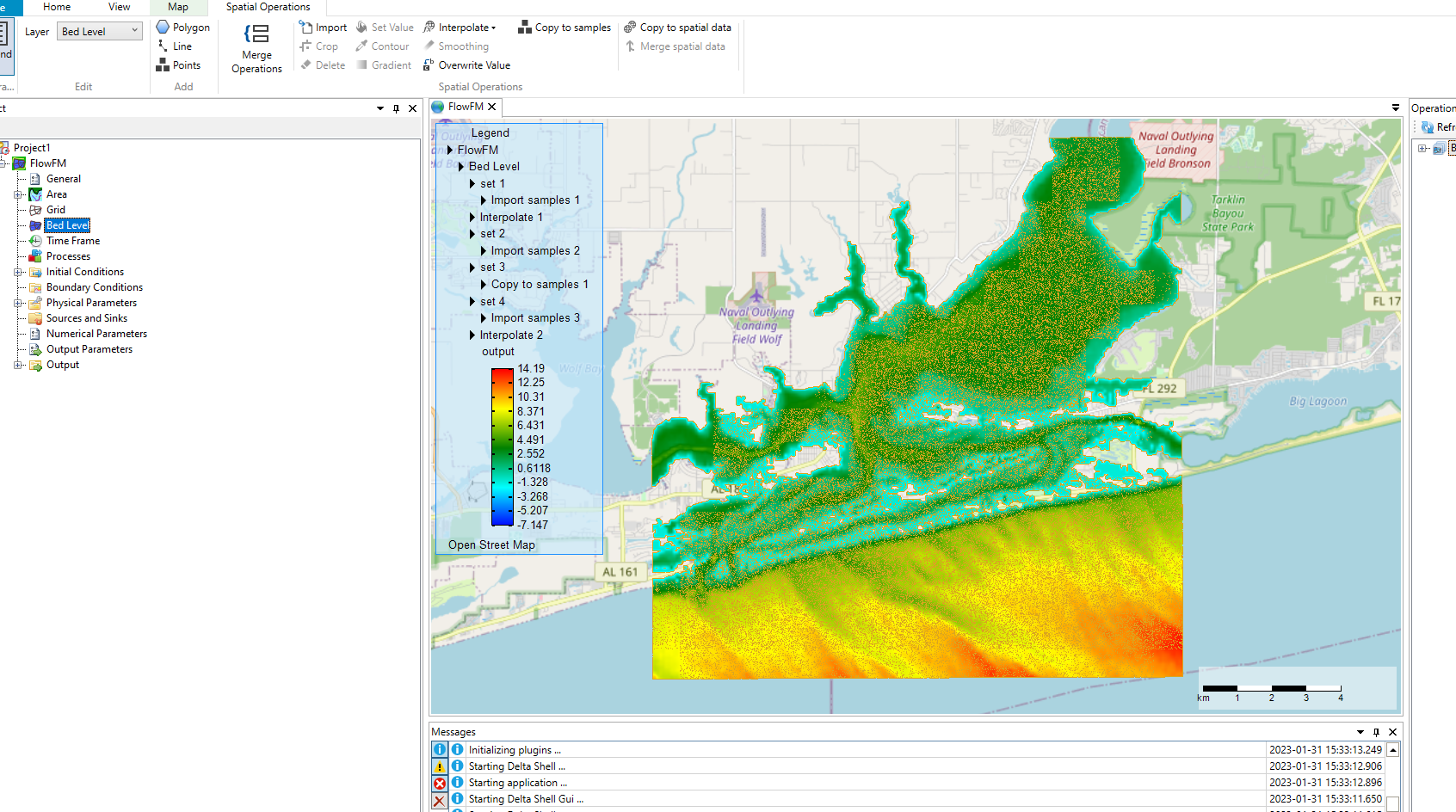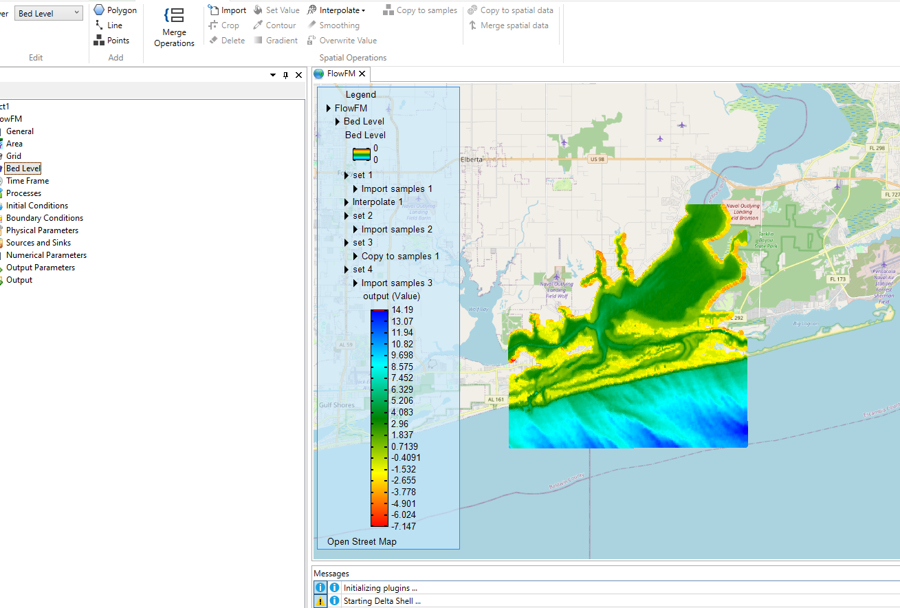 I brought bathymetry data into Delft Flow FM from Dashboard by converting the grid in FM Flow and then bringing the grid into Delft 3D and importing the bathymetry, and interpolating the bed level data onto the grid and exporting it to bring it into FM Flow. The bathymetry appears to be correct when I first import it into Delft 3D but then the values seem to flip. The edges of the grid (which are land) and should be the highest elevation are flipped to negative values. The bathymetry appears to be correct but with flipped values. Does anyone know why this might be occurring? I also have been bringing this bathymetry in to ArcPro in order to make a point cloud to hopefully re-shape the bedlevel to run simulations in Delft Flow FM but you can see that bringing in that bathymetry results in flipped values in ArcPro as well.