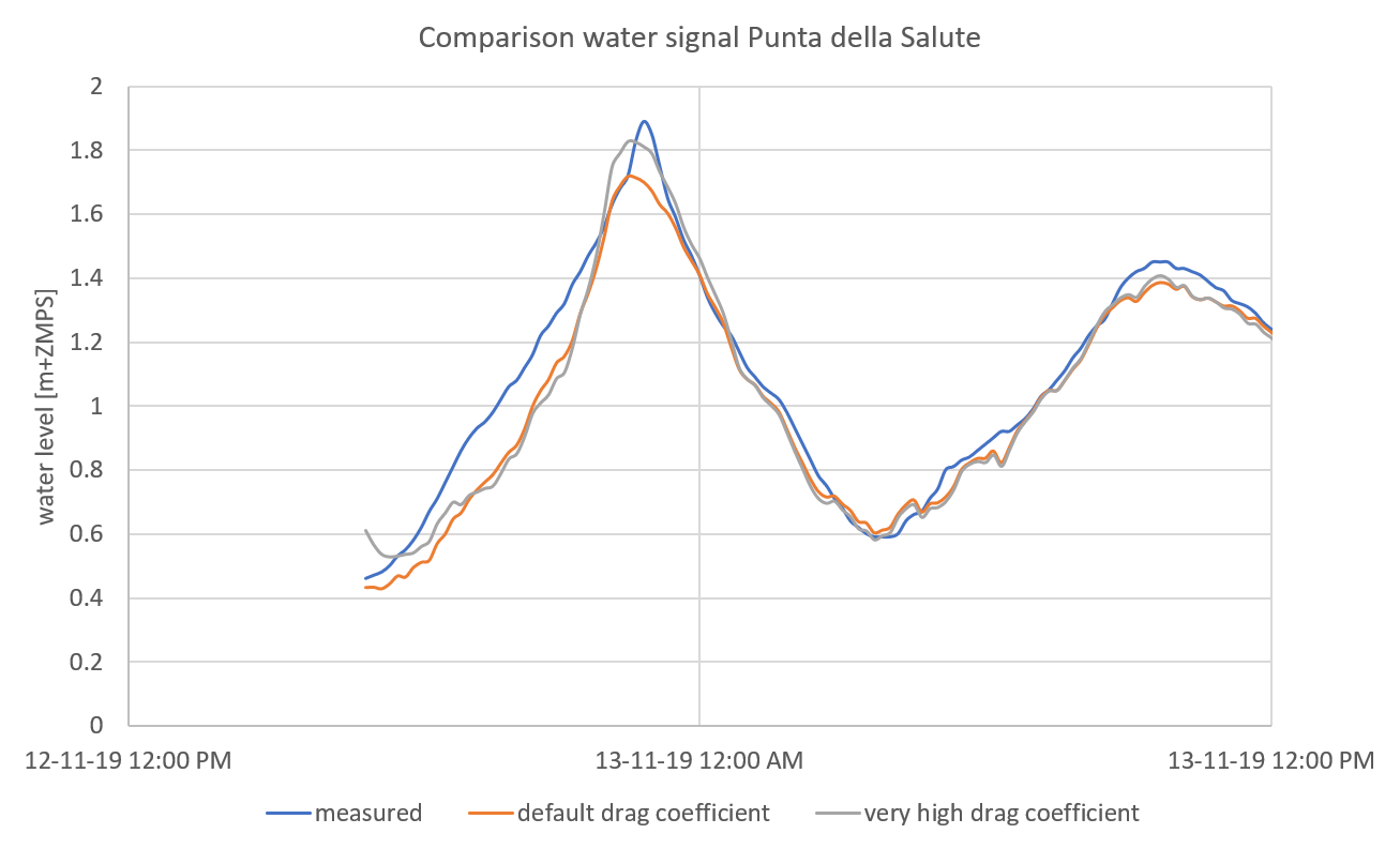I run a model of the Venetian lagoon, which has been calibrated against for the tide based on a extended period without the influence of wind (see tidalcalibration.png). Performance is really good. However, I want to actually run the model for very stormy conditions. When taking into account a uniform wind- and pressure field over the model domain which had been done in other studies as well the default linearly varying drag coefficient (cf. Smith and Banke (1975)) underestimate the peak by about 20 cms (see StormEvent_windDrag_adjustment.png). I have to change the wind drag coefficient for 100 m/s from 0.00723 to 0.0123 in order to be able to reproduce the peak.