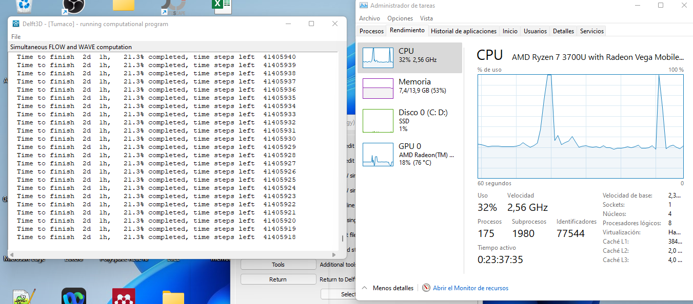 Hello everyone I am simulating a wave coupled morphodynamic model in the 32 bit version of delft3D 4.01.00 on a 64 bit machine, however at 24 percent of the simulation the program crashes and stops until a certain time step , I would like to know if any of you have experienced this error and to know what is the problem with this error, I suspect it is due to compatibility problems of the machine with the software, I am running the program on a 16gb ram with a ryzen 7 processor